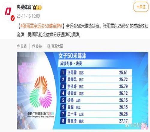 张雨霏夺得全运会女子50米蝶泳金牌 新京报 2025-11-17 17:02:03 据央视体育微博消息,全运会50米蝶泳决赛,张雨霏以25秒61的成绩收获金牌,吴卿风和余依婷分获银牌和铜牌。编辑 李忆林子 女子 蝶泳 上一篇: 邓智舰、陈佳鹏折戟男子百米预赛,广东队陈冠锋、严海滨晋级 下一篇: 郑小倩南京马拉松229,中长跑名将的全马首秀