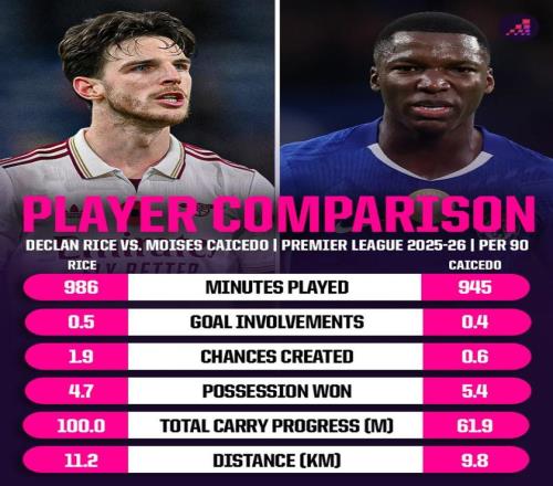 北京时间12月1日凌晨,英超第13轮比赛焦点战,切尔西将在主场迎战领头羊阿森纳,赛前,足球数据网站Opta对比了赖斯、凯塞多本赛季英超的数据。