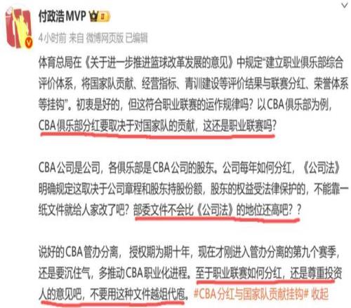 对此媒体人付政浩也发表了自己的意见:CBA俱乐部分红要取决于对国家队的贡献,这还是职业联赛吗?说好的CBA管办分离, 授权期为期十年,现在才刚进入管办分离的第九个赛季,还是要沉住气,多推动CBA职业化进程。至于职业联赛如何分红,还是尊重投资人的意见吧,不要用这种文件越俎代庖。