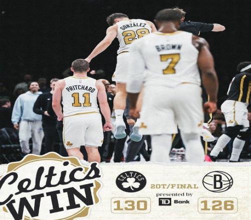 北京时间1月24日,NBA常规赛凯尔特人客场对阵篮网,双方前三节持续紧咬比分,凯尔特人第四节中段扩大10分优势,篮网强势扳平比分。首个加时赛,冈萨雷斯命中关键扳平三分,凯尔特人第二个加时赛表现出色,最终凯尔特人130-126双加时战胜篮网收获2连胜巩固东部第二,篮网遭遇4连败。
