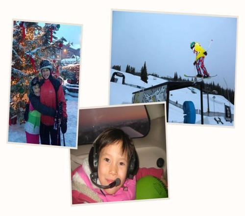10岁时的谷爱凌与母亲燕在太浩湖;约6岁时在飞机上;9岁时在科罗拉多州铜山举行的全国青少年比赛中。