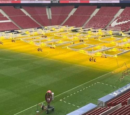 目前距离马竞对阵巴萨的首回合比赛仅剩48小时左右,球场内近一半区域覆盖着生长灯——这类模拟阳光的灯具常被用于高水平草坪的维护。2024年起,大都会球场开始使用Hatko Hybridgrass,这是一种新一代混合草皮,由西班牙公司Royalverd负责安装并提供技术支持。