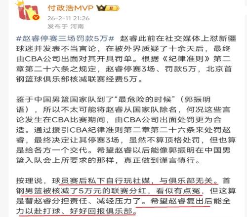 CBA名记付政浩,谈到赵睿被罚款,被停赛之事,他认为赵睿自己玩社媒,与俱乐部无关,与北京队无关,因此,北京队被罚款,有一点冤了……