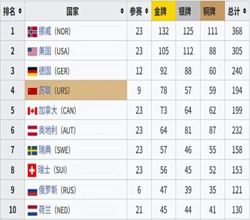 (冬奥会历史奖牌榜,图:Wiki)▼